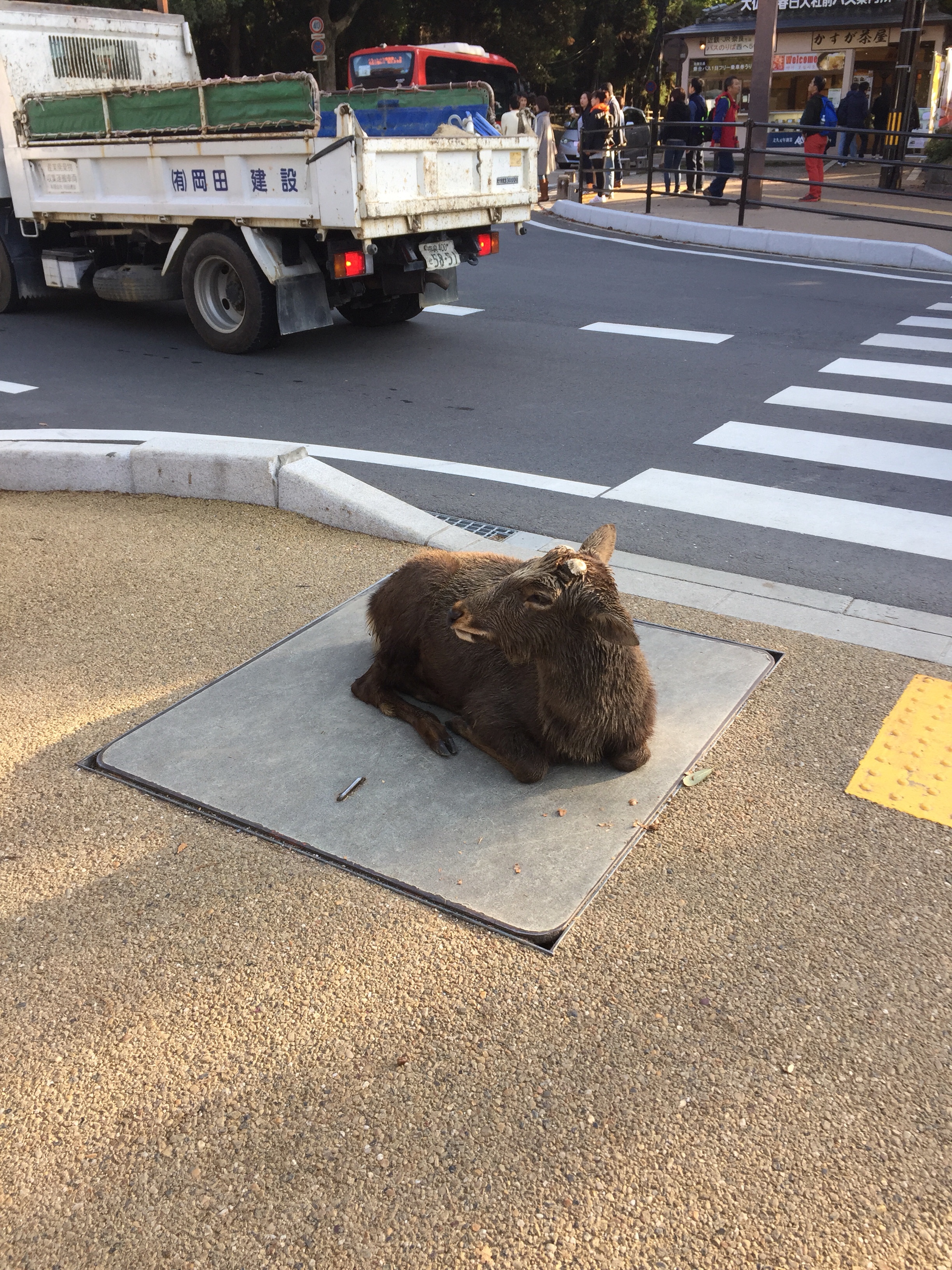 横断歩道の前に鎮座する鹿さん。今にも道路に出そうですよね。
